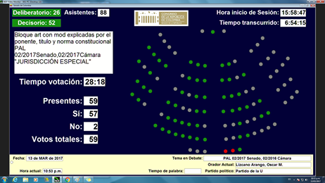 Tras siete horas de debate, la sesión plenaria del Senado aprobó por 61 votos contra 2, el articulado de la reforma constitucional que crea la Jurisdicción Especial para la Paz, que buscará poner un cierre al conflicto armado en la medida en la que se ocupará de los crímenes cometidos por las Farc, agentes del Estados y por actores civiles. Esta ley introduce una jurisdicción especial, de transición, para juzgar todos esos delitos.