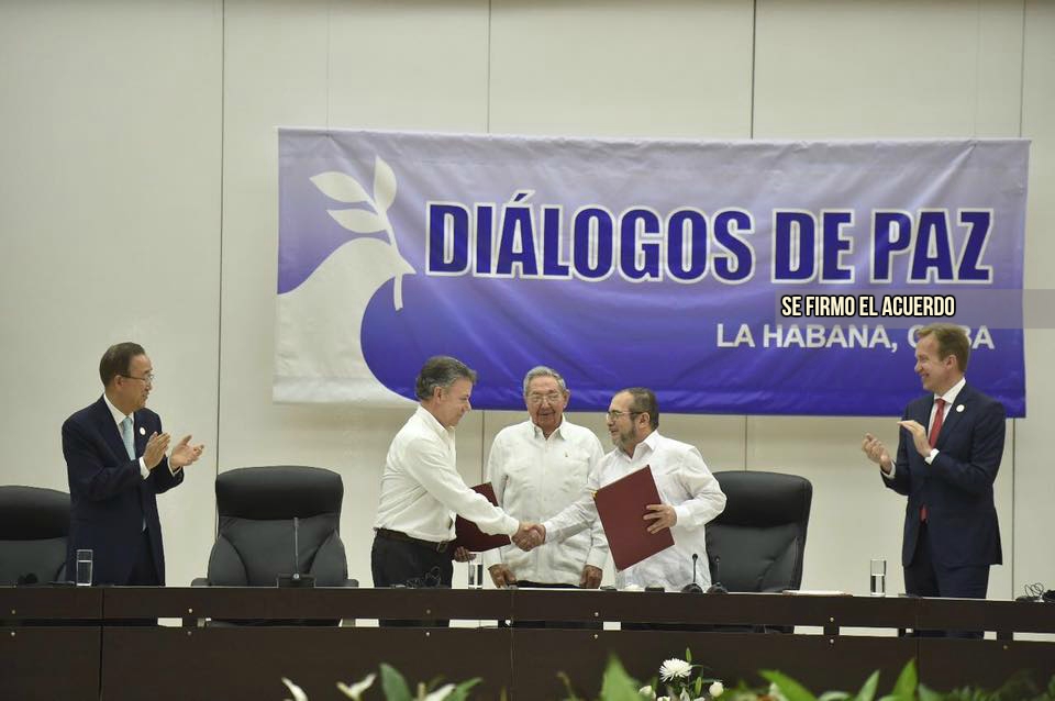 Santos, que presenció la firma del acuerdo junto al jefe máximo de las Farc, Timoleón Jiménez, señaló que el pacto alcanzado “significa ni más ni menos el fin de las Farc como grupo armado”.